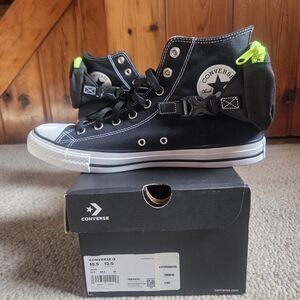 Stylish Converse high-tops in black. Features neon green accents and classic white sole. Comes with removable shoe packs that easily snap on or off. These shoes are brand new with original box but no tags. Relaced with 45 " laces and comes with grenade lace locks. Never Worn.