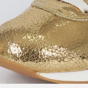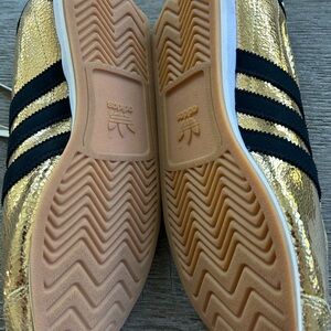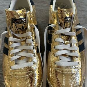 Metallic gold sneakers with bold black stripes. Iconic Adidas style.