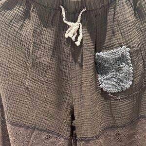 Comfortable brown joggers. Textured fabric with a unique pocket detail. Elastic waistband and cuffs.