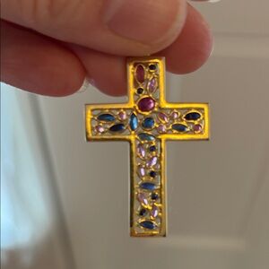 This stunning cross pendant features different delicate gemstones inlaid in 14kt yellow gold. About 1.5" long and weighs 5 grams. Gorgeous piece is excellent condition.