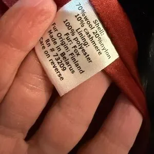 Marvin Richards black lambswool coat with fox fur trim and a red interior lining.