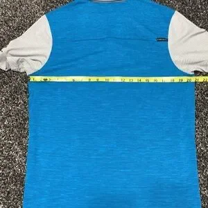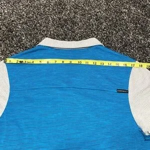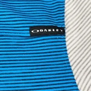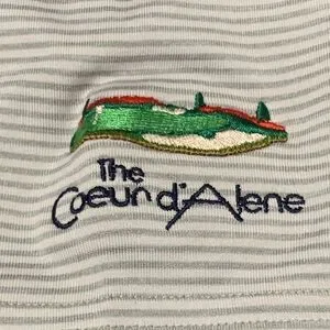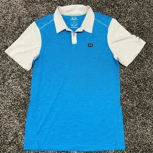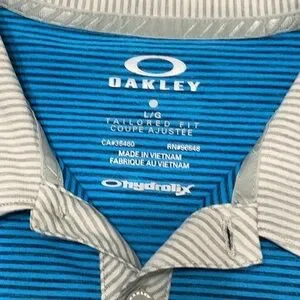 EUC polo top made by Oakley and sold by The Coeur d’Alene Golf resort, as shown on left sleeve logo. The colors are turquoise, navy. And gray. No call outs.