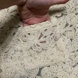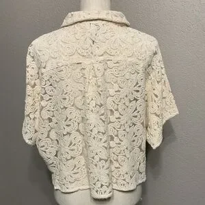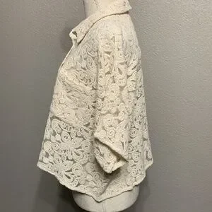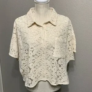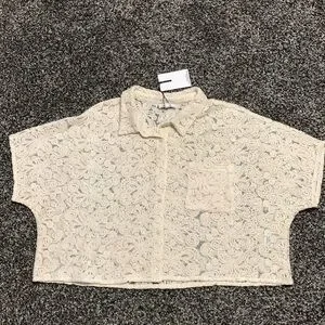 NWT beautiful cream embroidered lace and mesh top. Mother of pearl button closure with one chest pocket. This top is see through and makes a great layering piece.