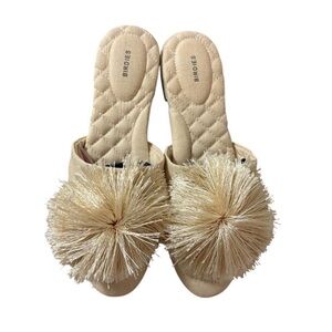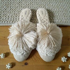 Birdies Songbird Pom Pom Linen Fabric Crème Slides Ballet Flats Mules Size 7.5