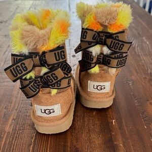 Charming UGG boots for kids with fluffy yellow and orange details. Features stylish UGG branded bows.