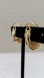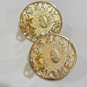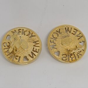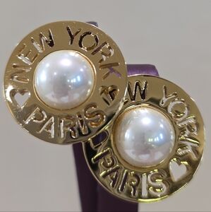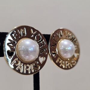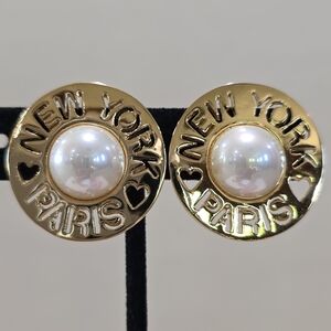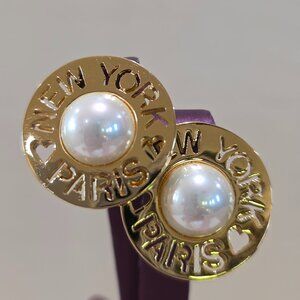They feature a round half sphere faux pearl cabochon on yellow gold plated clip earrings with cutout lettering NEW YORK PARIS on medallions.