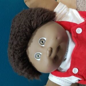 Cabbage Patch Kids 80’s African American Boy with Afro, dimple original clothes. has diaper, soxks, shoes,shirt and overalls. brown eyes and 1 dimple. short hair.