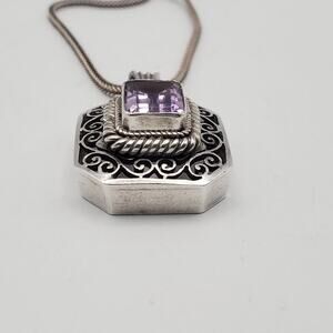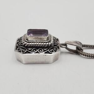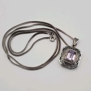 This vintage 925 sterling silver Art Deco filigree amethyst gemstone necklace features a rectangular pendant with a beautiful amethyst stone in a baguette shape. The necklace is signed and has a spring ring closure. With a necklace length of 24 inches, it is the perfect piece for various occasions such as engagement, wedding, anniversary, birthday, and more. The intricate design, retro style, and beauty of this necklace make it a charming and timeless piece of fine jewelry for any jewelry department.