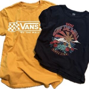 Set to two Vans Tee, both in adult medium. Gold shirt with classic checkered logo design, in a classic tee cut. Black shirt with graphic design on front, in a shorter or cropped cut style. Both perfect to wear as comfort and fashion. Great condition, smoke free environment.
