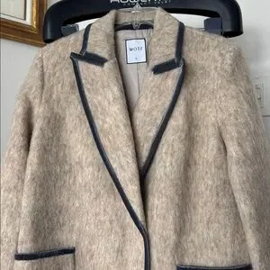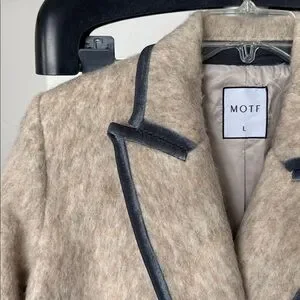 Motf Wool Blend Beige Ivory Long Duster Coat/Jacket Sz L Blue Velvet Trim