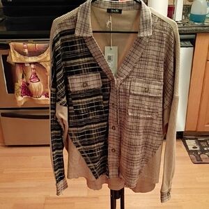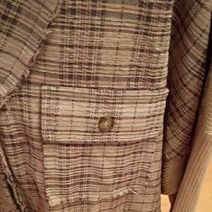 Chic checkered blazer with button front. Features two chest pockets. Ideal for layering. bust 26, length 30
