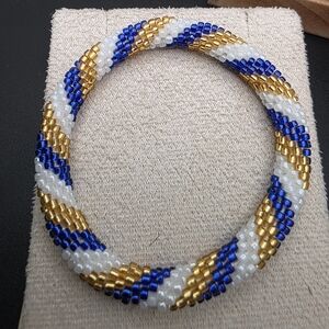 This stunning beaded bracelet features a beautiful combination of blue, gold, and white beads. Perfect for adding a touch of elegance to any outfit.
