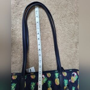 NWT! Small trimmed Vera in Toucan Party print. This print is retired. Faux leather trim. Quilted material. This is such a fun printed bag! It has pineapples along with toucans and crabs on a dark blue background! Definitely great for the warmer months! Measurements in photos. The outside has a pocket on each side, and the inside has 6 pockets! This bag can fit a lot- everything you need for the day!