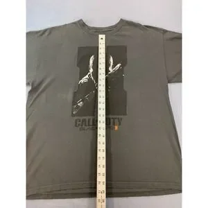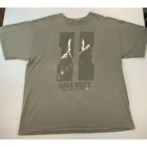 The product is a Call of Duty Black Ops 2 T-Shirt in grey, size XL, featuring a graphic print design with the Call of Duty logo accents. Made of cotton and machine washable, this short sleeve shirt has a crew neck and regular fit, making it suitable for all seasons. The tagless shirt is ideal for men who are fans of the video game franchise and looking for a comfortable and stylish addition to their wardrobe.