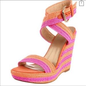 Vibrant wedges with orange and pink woven design. Features an adjustable ankle strap. Perfect for adding a pop of color.