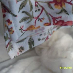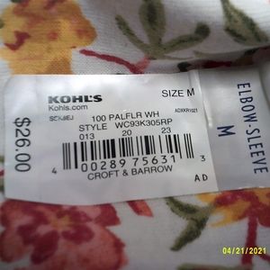 NWT!! Women's size Medium floral 100% cotton knit v-neck elbow length sleeve top in white yellow green and peach by croft & barrow. 19" pit to pit and 25" back length. Hi-Lo hem, gold and white braid trim. natural fiber comfort work church beach travel vacation leisure boating cruise camping hiking biking stylish natural fiber comfort prairie core cottage core granny core