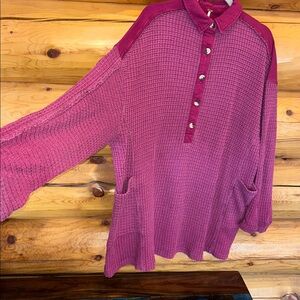 Free People GUC Wilder Polo Size Small in Boysenberry…super cute oversized slouchy relaxed fit thermal Henley tunic top, contrast fabric piecing on collar, shoulders and back, ombre detail at bottom, longline tunic style fit, dropped shoulders, button front Henley style, defined seaming details, side pockets, classic collar, raw hem on bottom hem and cuffs, 60% cotton 40% polyester, trim 100% cotton