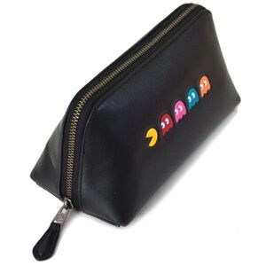 This is a small zip Coach cosmetic case featuring a Pac-Man Gamer theme. It is made of black/multi-colored leather and is adorned with Pac-Man characters. Excellent used condition. Perfect for storing cosmetics or small accessories in style.