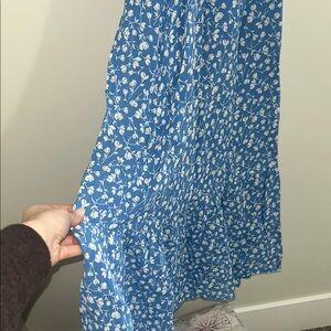 Charming maxi dress with blue and white floral pattern. Features a fitted bodice and flowing skirt. Perfect for warm days.