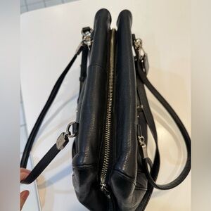 Elegant Coach satchel made from soft black pebbled leather with silver-tone hardware. Features the signature Madeline front turnlock bar, dual shoulder straps, and a detachable crossbody strap. Top zip closure with a spacious interior. Classic, versatile, and perfect for everyday use.