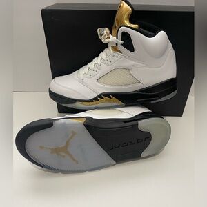 Air Jordan 5 Retro 'Olympic', also known by their colorway as "Olympic Gold Medal" or "White/Black-Metallic Gold Coin".