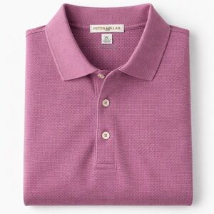 Peter Millar, men’s polo, cotton polo, mauve polo, shirt, micro dot polo, textured polo, golf shirt, classic menswear, preppy, elevated basics, quiet luxury, country club style, work casual, business casual, made in Korea, XL men’s shirt, relaxed fit polo. Last photo shows the most accurate color.
