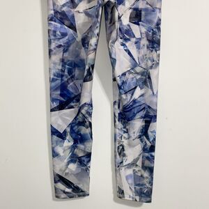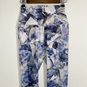 EVCR Evolution And Creation Leggings Women's M Capri Cropped Length Workout Athletic Running Yoga Training Gym Exercise Fitness Lounge Errands Modern City Coast Trendy Girly Cute Diamond Gem Crystal Jewel Prism Print Pattern Design. High waist pull on style. Blue, white, purple, black, gray, pink and green in color. 85% polyester and 15% spandex. Pre-owned, very gently used with no flaws and tons of life left. Please see all pictures and read the measurements.