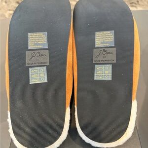 • Rubber sole. Tan suede slippers with soft white lining. Durable sole for comfort.