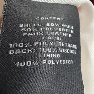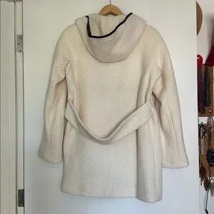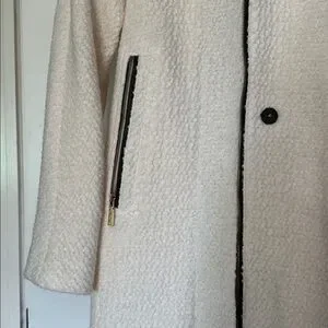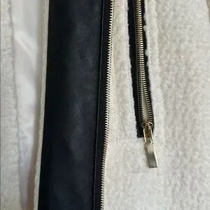 Vince Camuto brand. Size small. Color ivory with black trim. Vegan leather trim around hood pockets and zip. Zipper and button closure. Gold hardware. Two zip close pockets. Stay warm and stylish with this elegant white and black hooded coat. Sherpa wool teddy style. Perfect for any occasion, this coat combines comfort with a chic design. Stock image used to show style and fit. Excellent condition. 50% wool. Blend. Fully lined