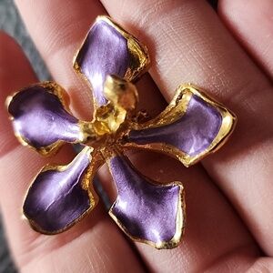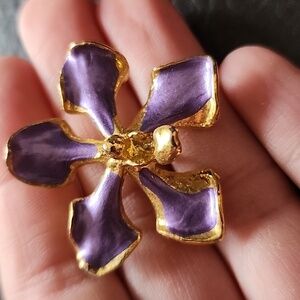 Add a touch of elegance with this stunning purple and gold flower brooch/pendant. Perfect for any occasion. Approx 1.35" in diameter- normal wear- good condition