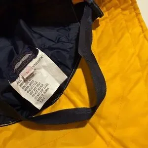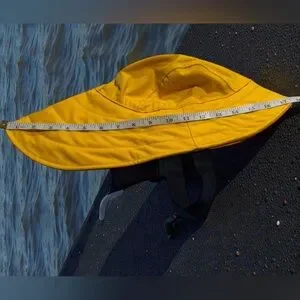 Vibrant yellow sou’wester rain hat that is for the serious boaters and fisherman. It has a chinstrap perfect for windy days. The long brim in the back keeps the rain off your neck and from going down into your jacket. West Marine is a well-known supplier of superior boating gear. This hat is preowned, but it looks and feels brand new. No flaws were evident on the hat.