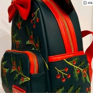 Charming Disney mini backpack with holly leaf design. Features a bright red bow and festive accents.