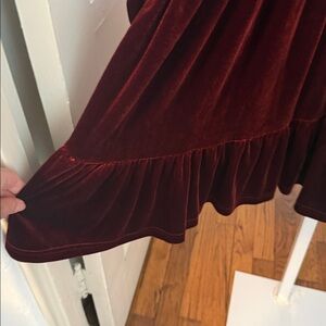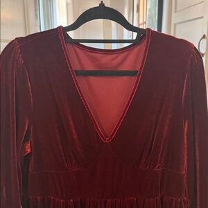 This is a gorgeous dark red maroon velvet dress with long sleeves. There’s elastic at the wrist. Ruffle across the bottom. Empire waist and V-neck. Size 1X. The pit to pit is 20 to 24 inches, with a length of 35 inches.