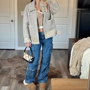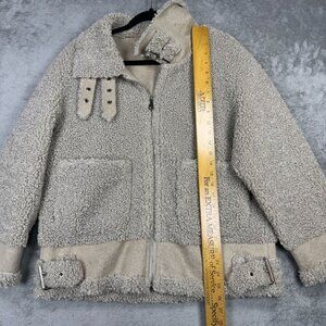 Stunning and cozy sherpa teddy aviator jacket with faux suede trim, zip front, buckle collar + waist tabs and pockets. Minimalist chic and quiet luxury vibes in color "neutral". Retail price: $275