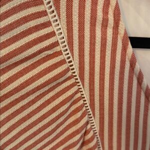 Gorgeous striped dress with ruffles and lace. Buttons up the front of the bodice. Elastic waist. Ruffle at the bottom. Fully lined. The shell is rayon and spandex. The lining is polyester size XL 22 to 27 inches pit to pit, 37 inches long.
