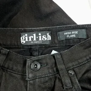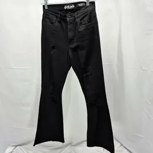These are a pair of GIR.L.ISH brand high-rise, flare leg jeans in a faded black wash. They are made from a stretchy denim material, typically composed of 99% cotton and 1% spandex for a comfortable, curve-hugging fit. The jeans feature distressing on both legs and a trendy, unfinished raw hem at the ankle. They have a classic five-pocket design and a zip fly with button closure. These jeans are in excellent condition and would be a stylish addition to any wardrobe.
