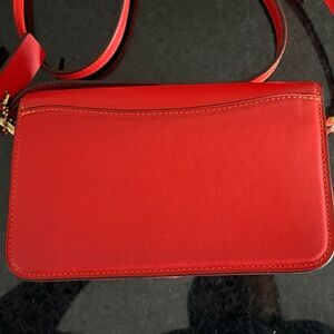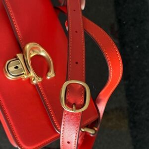 Please note: this is a preloved item. I have worn it, but it is in good condition. There are two small spots at the bottom of bag, three spots at the back of bag, one small spot on flap of bag, one spot in front of bag and two small scratches in front of bag. This is glove tanned leather! This bag is from the Coach boutique. Not an outlet bag. Please check photos before purchasing.