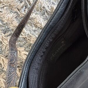 Chateau shoulder bag in sleek black. Features intricate butterfly detail. Perfect for any occasion.