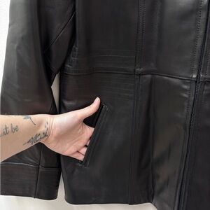 Classic vintage black soft leather jacket. Pointed collar. Front zip. Slip pockets. Black jacquard Jones New York lining. 100% genuine leather. Nylon, acetate lining. Great vintage condition.