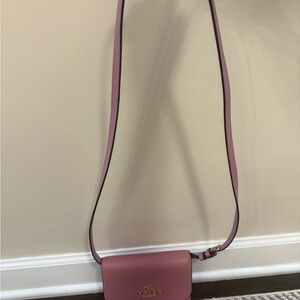 The Mauve Pink COACH Crossbody Purse is a designer handbag with a solid rectangular shape in a beautiful pink leather exterior. It features a zip closure and a crossbody strap in matching pink leather, making it a stylish and functional accessory for women. The purse also includes a detachable/adjustable strap for added versatility. With its high-quality materials and reputable Coach brand, this crossbody purse is a fashionable and practical choice for everyday use.