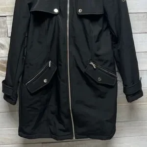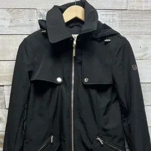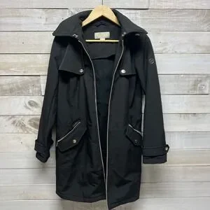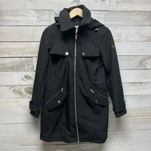 Michael Kors Trench Coat Womens Small Black Hooded Full Zip MK Logo Lined
