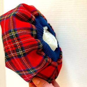 -red plaid pattern with navy pom pom