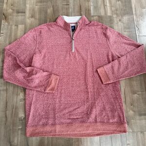 Johnnie-O Quarter Zip Sweater Red Heather Men 2XL Sully Crimson. This quarter zip style sweater from Johnnie-O is a perfect layering piece. It can be dressed down with a t-shirt and jeans or be worn over a button up with khakis. This is the Sully style in a crimson heather colorway. The quarter zip is a stretchy and soft piece. It does have a leather look pull on the zipper. Measurements and condition are shown in the photos.