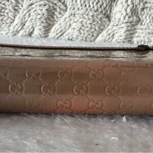 Chic Gucci pouch with signature embossed design. Stylish tan hue.