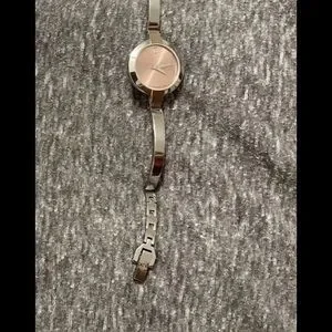 Stylish Movado watch with a sleek two-tone design. Features a rose dial and silver accents.