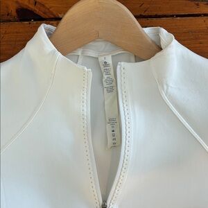 Stylish white crop top. Features a half-zip front. Long sleeves for added coverage. Perfect for active wear.