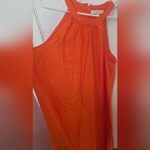 Bright orange sleeveless halter dress. Perfect for summer outings. Zipper back with button closure details.