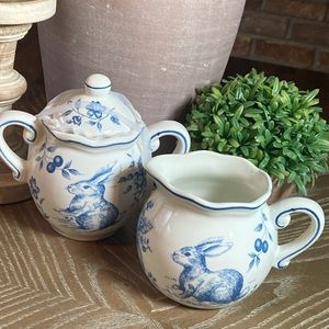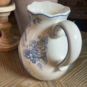 Absolutely Exquisite! LARGE Vintage Inspired Shabby Chic French Cottage Victorian Creamy White & Blue Toile dual sided Ceramic pitcher! This beautiful pitcher is so detailed with a long gorgeous curved handle with blue accents & scalloped rim spout! This fantastic pitcher has one side featuring a lovely spring bunny rabbit roses & flower toile pattern! The other side features a large blue roses flowers & berries! Fabulous accent for your home this spring Easter holiday season & beyond! Use year round! Fantastic serving piece for your tabletop or coffee bar or beverage center! Perfect to serve your favorite cocktail, cider, water or Sangria Add dried or silk flowers & Use as a centerpiece! Fantastic addition to your kitchen, dining room, table or cabinet hutch when not in use! Find coordinating serving trays, dishes, plates, creamer sugar set & more as seen in the last photos listed separately in our closet!