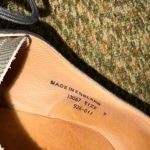 black leather with greenish grey embossed crocodile design leather uppers. made in england. mismatched laces. the size is marked 7. i typically wear UK 7 in doc martens and tredair, but these ran larger on me. I’d imagine best fit is mens US 7.5-8 or womens US 9.5-10.