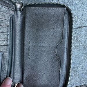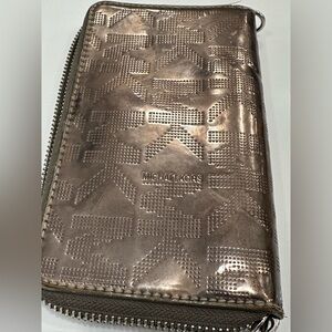 Michael Kors metallic wallet with embossed logo pattern. Features a sleek zip closure and metallic brand plaque.